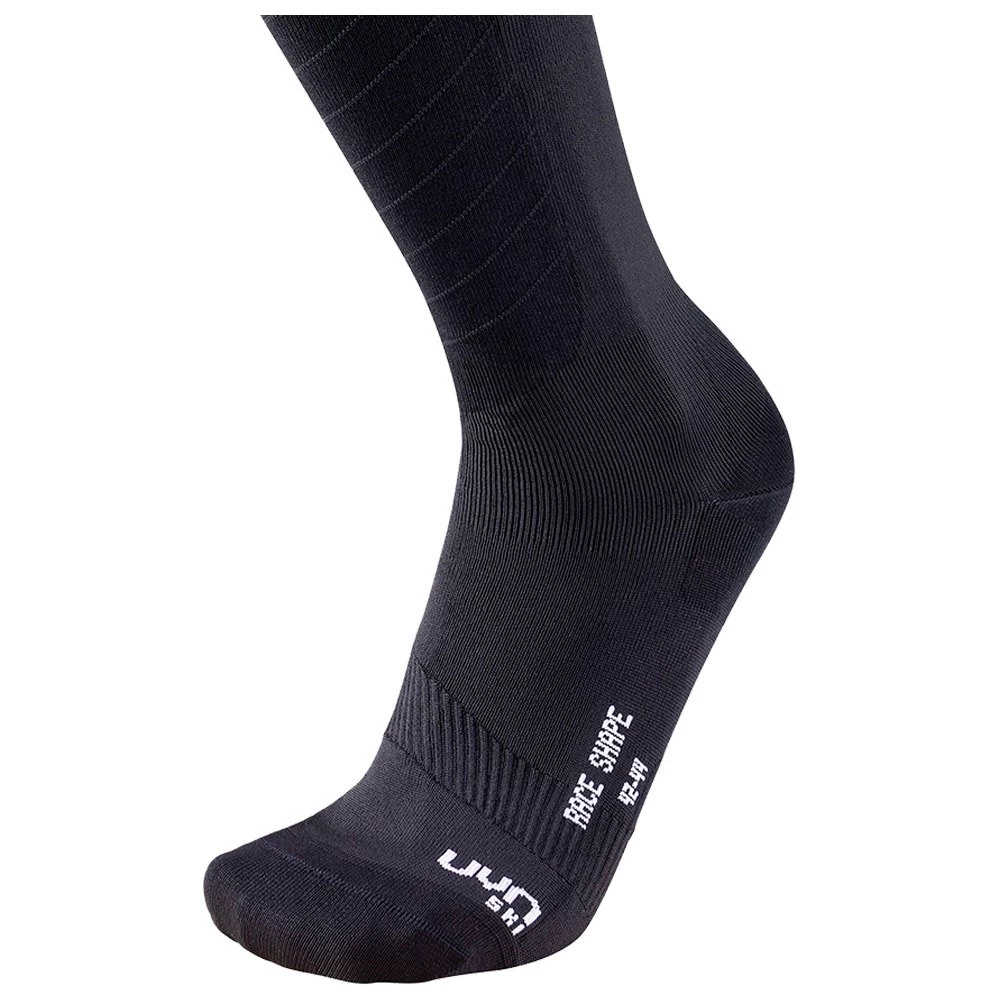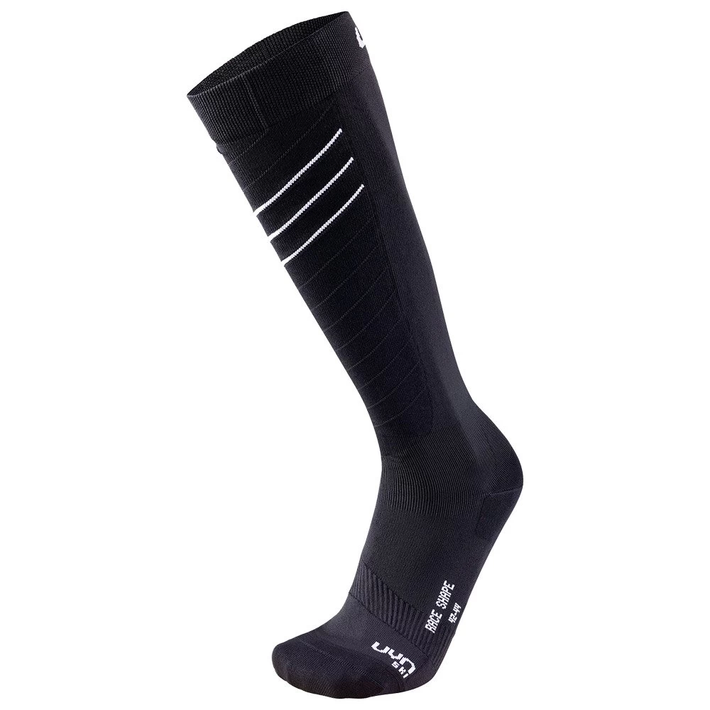 Les chaussettes de ski Race Shape de la marque UYN sont conçues pour offrir le meilleur soutien possible dans une pratique sportive. Elles épousent très confortablement les pieds, les chevilles, les tibias et montent jusque sous les genoux. Elles offrent un bon amorti des chocs côté semelles. Elles protègent l’avant des chevilles sur le haut du pied, les malléoles, la partie sensible du tendon d’Achille.